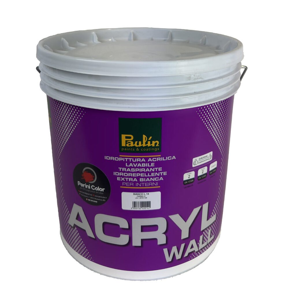 ACRYLWALL di Paulin è una pittura murale acrilica opaca pensata esclusivamente per interni. Si distingue per il suo effetto vellutato, il bianco particolarmente luminoso e le ottime prestazioni di idrorepellenza — caratteristica insolita per una pittura da interni. Adatta a chi cerca un risultato curato e duraturo, senza rinunciare alla praticità.